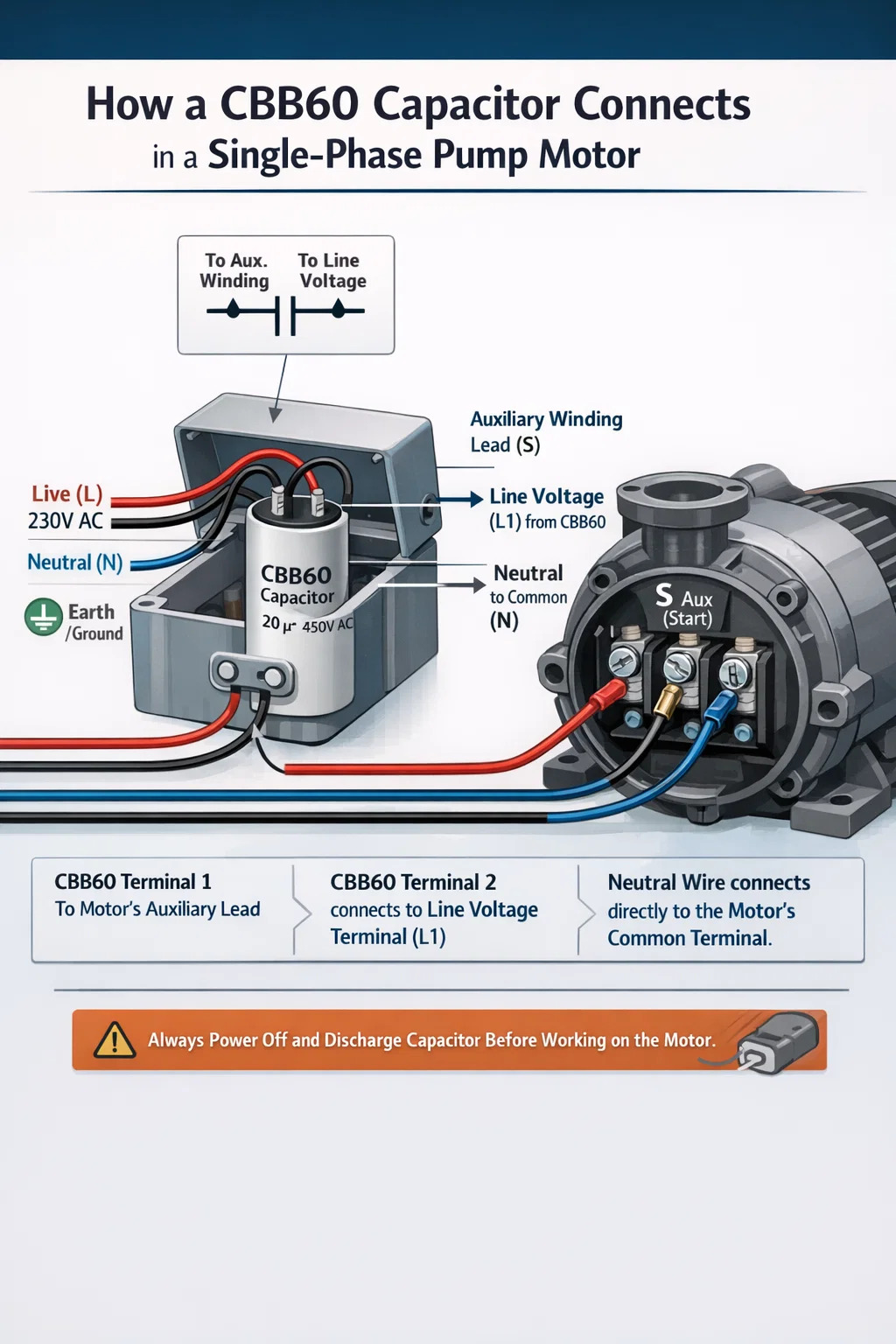 Untuk senario yang paling biasa — motor pam satu fasa dengan kotak kapasitor luaran — wayar hidup masuk dan penuntun tambahan motor kedua-dua mendarat di CBB60, manakala neutral bersambung terus ke terminal biasa motor. Motor berjalan kerana arus melalui kapasitor membawa voltan bekalan kira-kira 90 darjah, menghasilkan medan magnet berputar yang bekalan satu fasa sahaja tidak dapat mencipta.