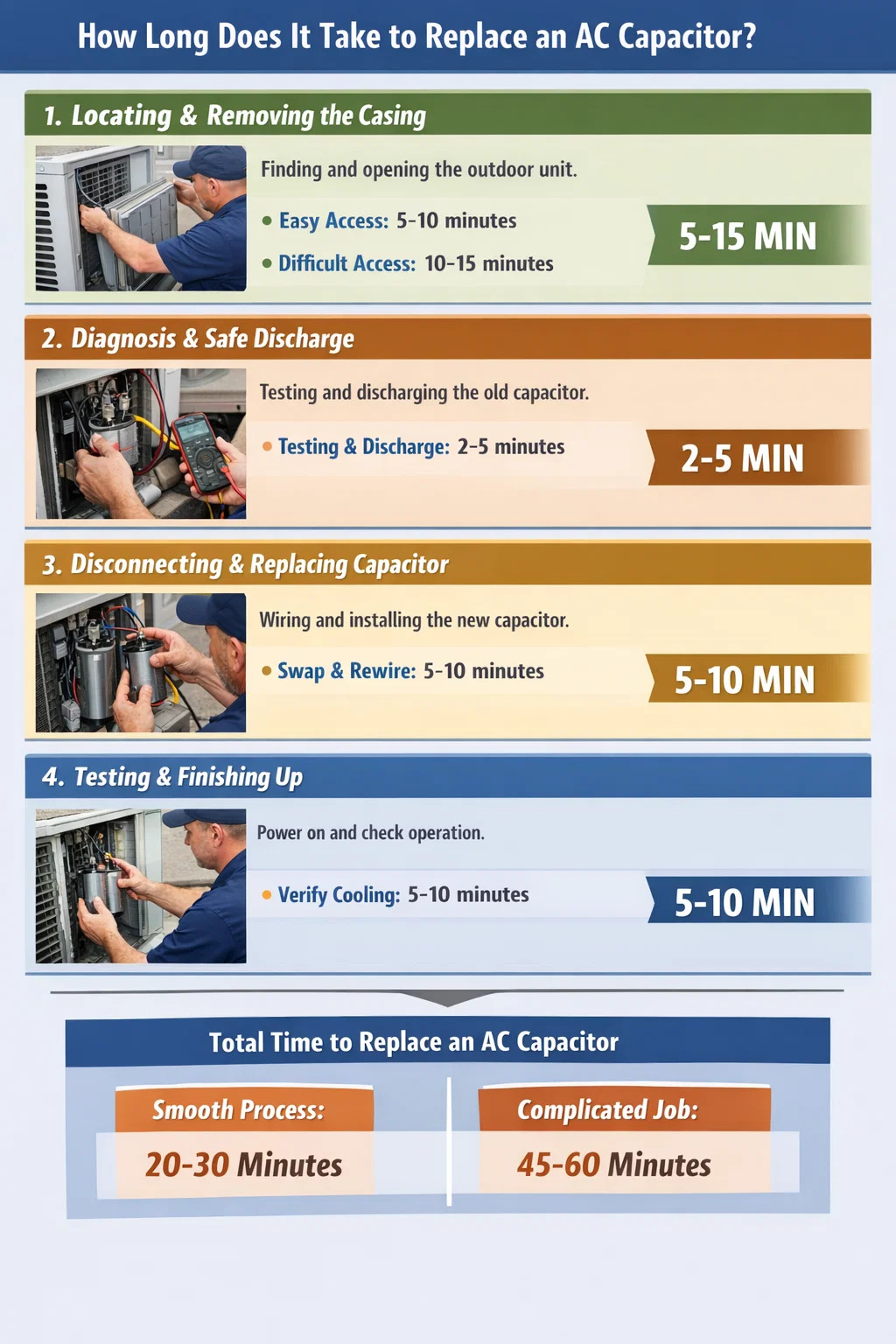 Berapa lama masa yang diambil untuk menggantikan an Kapasitor AC ? Jika anda hanya melihat beberapa minit juruteknik bekerja, anda mungkin fikir kerja itu sangat pantas. Tetapi dari saat juruteknik tiba sehingga penghawa dingin meniup udara sejuk semula, terdapat proses yang lengkap.