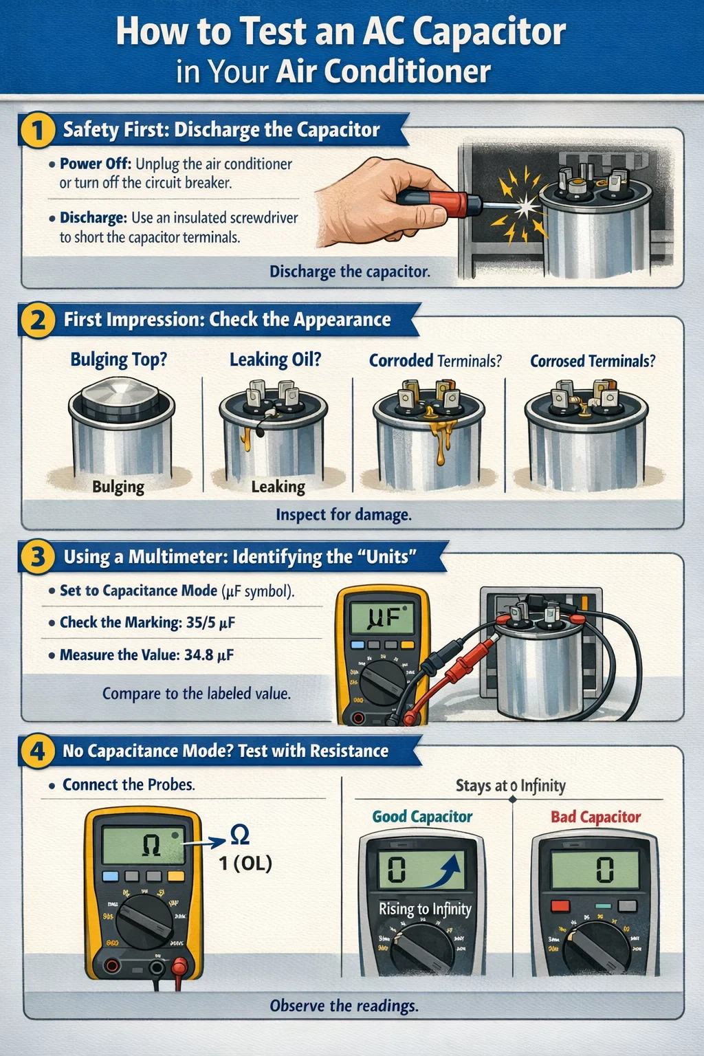 | teruk | Bacaan ialah 0, hampir sifar, atau meter menunjukkan "OL" (Gelung Terbuka). | Mati. Kapasitor telah gagal sepenuhnya. Unit AC tidak akan bermula; gantikannya dengan segera. |