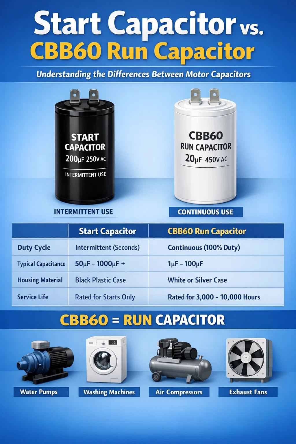 Perbezaan Fungsian: Mulakan Kapasitor lwn. CBB60 Run Kapasitor