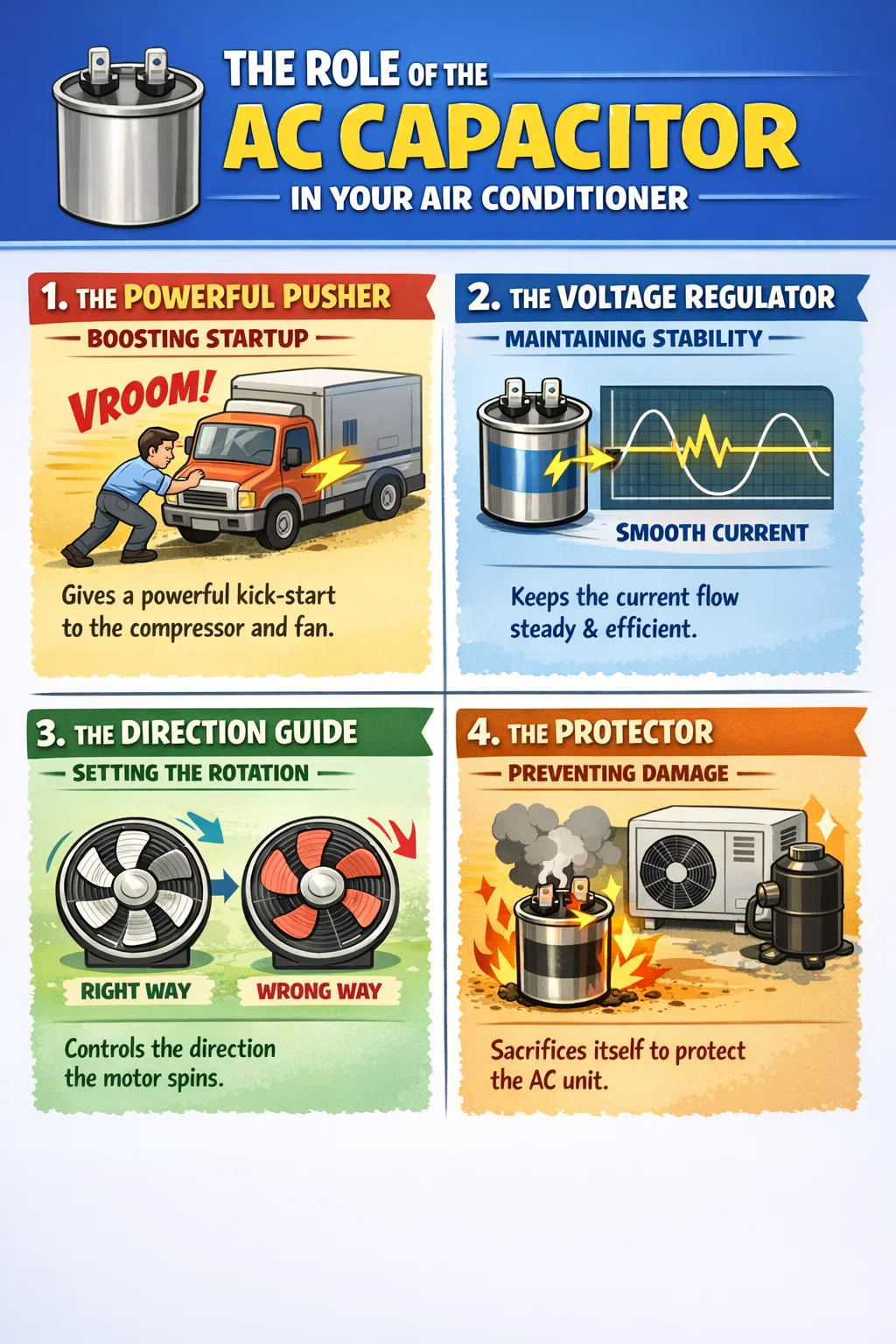 The Kapasitor AC (kapasitor penghawa dingin) adalah seperti "bateri sandaran" atau "booster" dalam penghawa dingin anda. Walaupun ia kecil, biasanya hanya tin logam perak kecil, penghawa dingin anda tidak akan dapat berfungsi tanpanya.