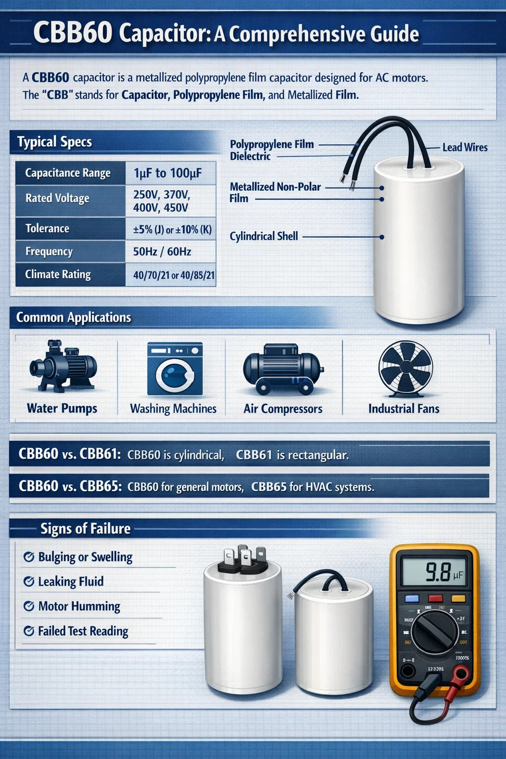 A Kapasitor CBB60 ialah sejenis kapasitor filem polipropilena berlogam khusus yang direka khas untuk aplikasi motor AC. Penamaan "CBB" bermaksud komposisi bahannya: "C" untuk kapasitor, "B" untuk dielektrik filem polipropilena, dan "B" kedua untuk filem metallized bukan kutub. Kapasitor ini secara rasmi diklasifikasikan sebagai kapasitor larian, bermakna ia kekal dalam litar semasa motor beroperasi untuk mengekalkan tork dan meningkatkan kecekapan.