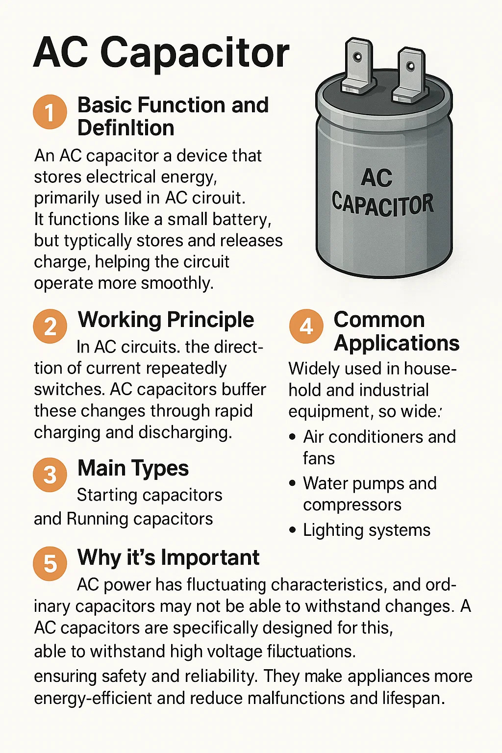Kapasitor AC adalah peranti yang menyimpan tenaga elektrik, terutamanya digunakan dalam litar AC. Ia berfungsi seperti bateri kecil, tetapi berfungsi dengan cara yang berbeza -ia tidak menjana elektrik; Sebaliknya, ia sementara menyimpan dan melepaskan caj, membantu litar beroperasi dengan lebih lancar. Walaupun kapasitor biasa mungkin digunakan dalam peranti DC, kapasitor AC direka khusus untuk ciri -ciri kuasa AC, kerana arah dan magnitud arus AC sentiasa berubah.